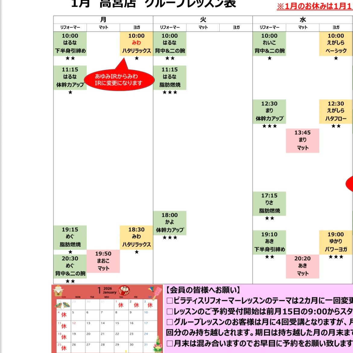 本日(15日)より1月のグループレッスンの