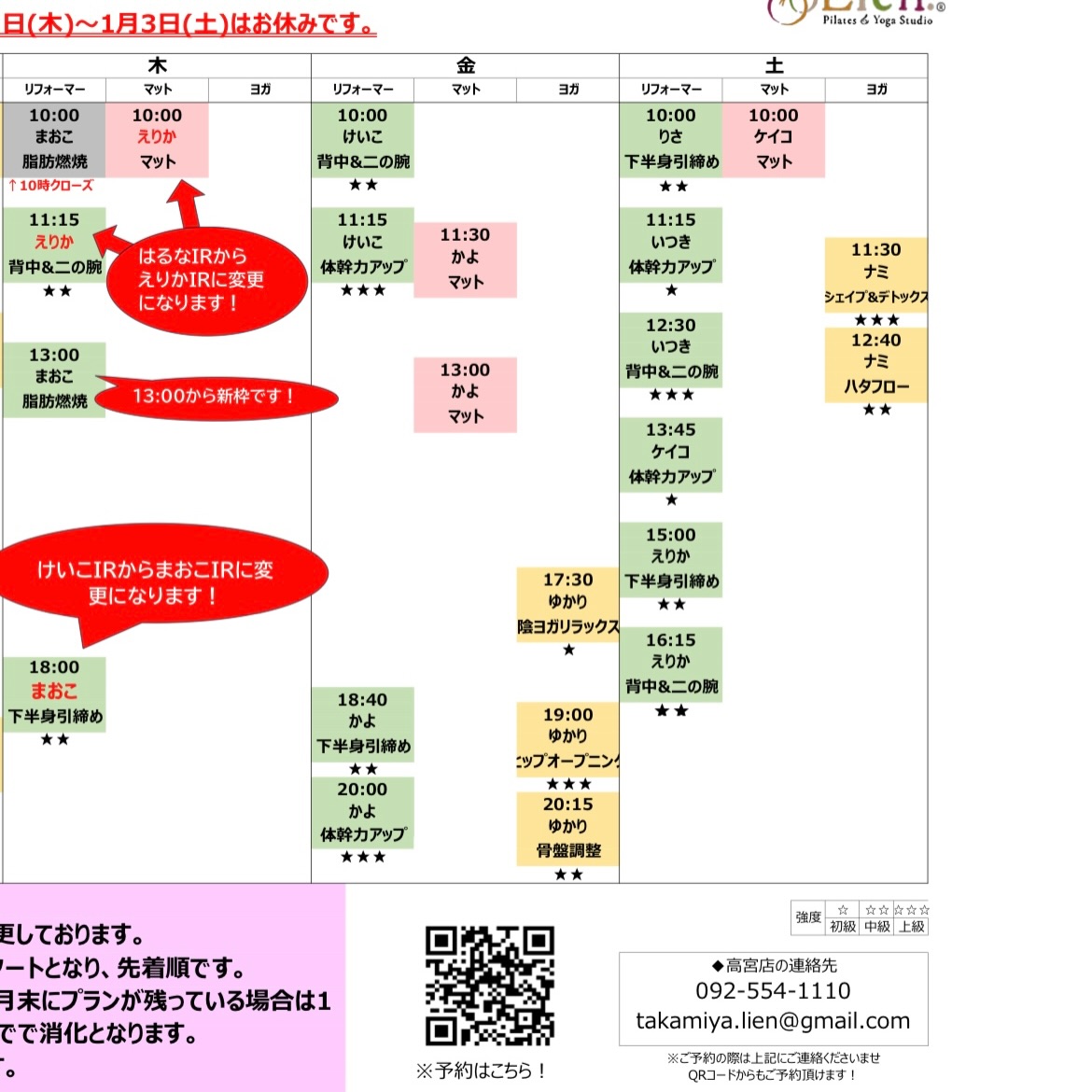 ・木曜日11:15〜ピラティスリフォーマー はるなIRからえりかIRに変更